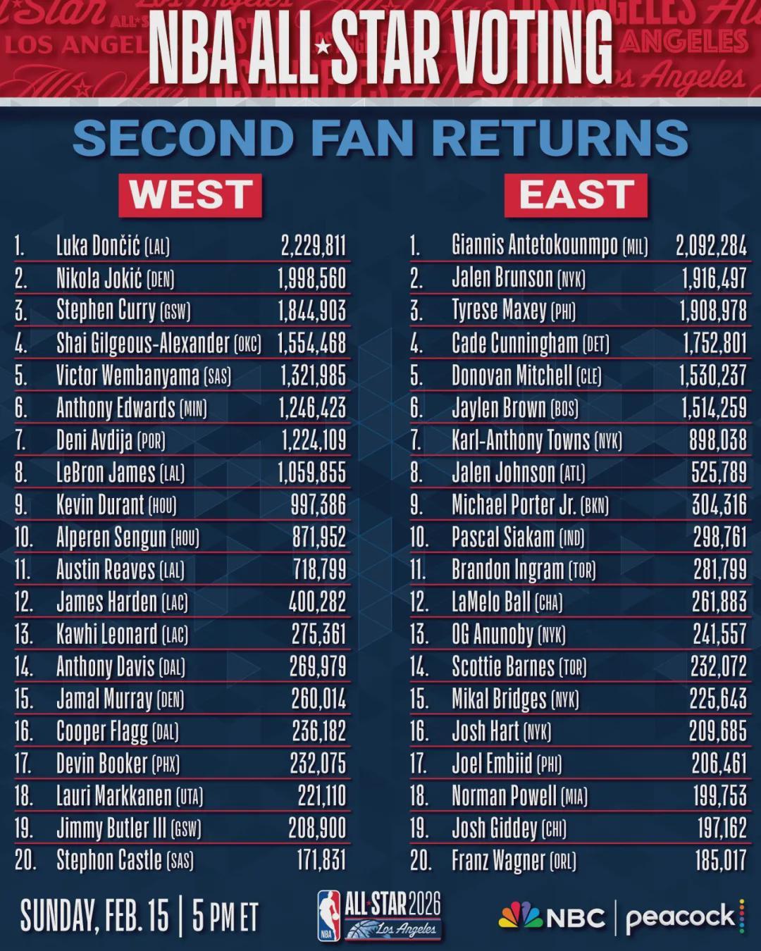 NBA全明星球迷投票次轮结果已经出炉,西部东契奇(2229811)领跑,约基奇(1998560)则紧随其后,库里第三,亚历山大第四,文班亚马第五,爱德华兹第六,阿夫迪亚第七,詹姆斯第八,杜兰特第九,申京第十等等;东部那边字母哥(2092284)、布伦森和马克西分列前三。